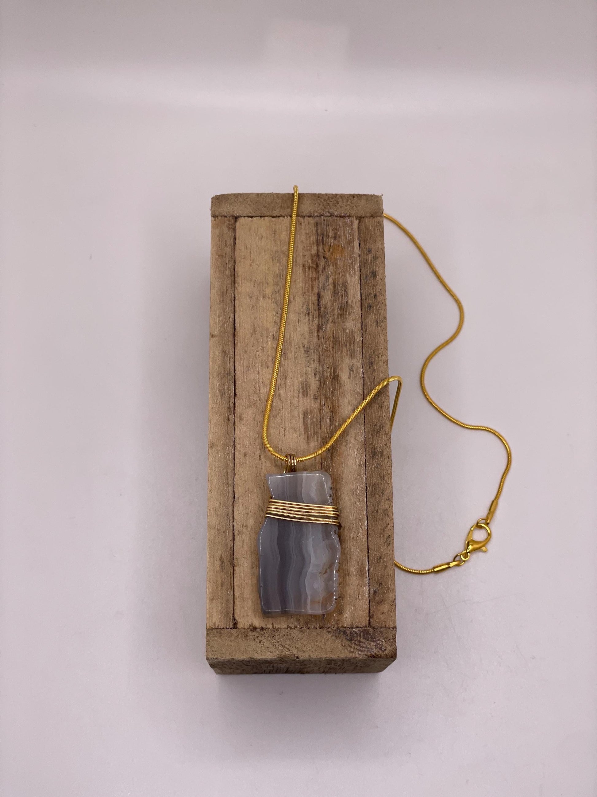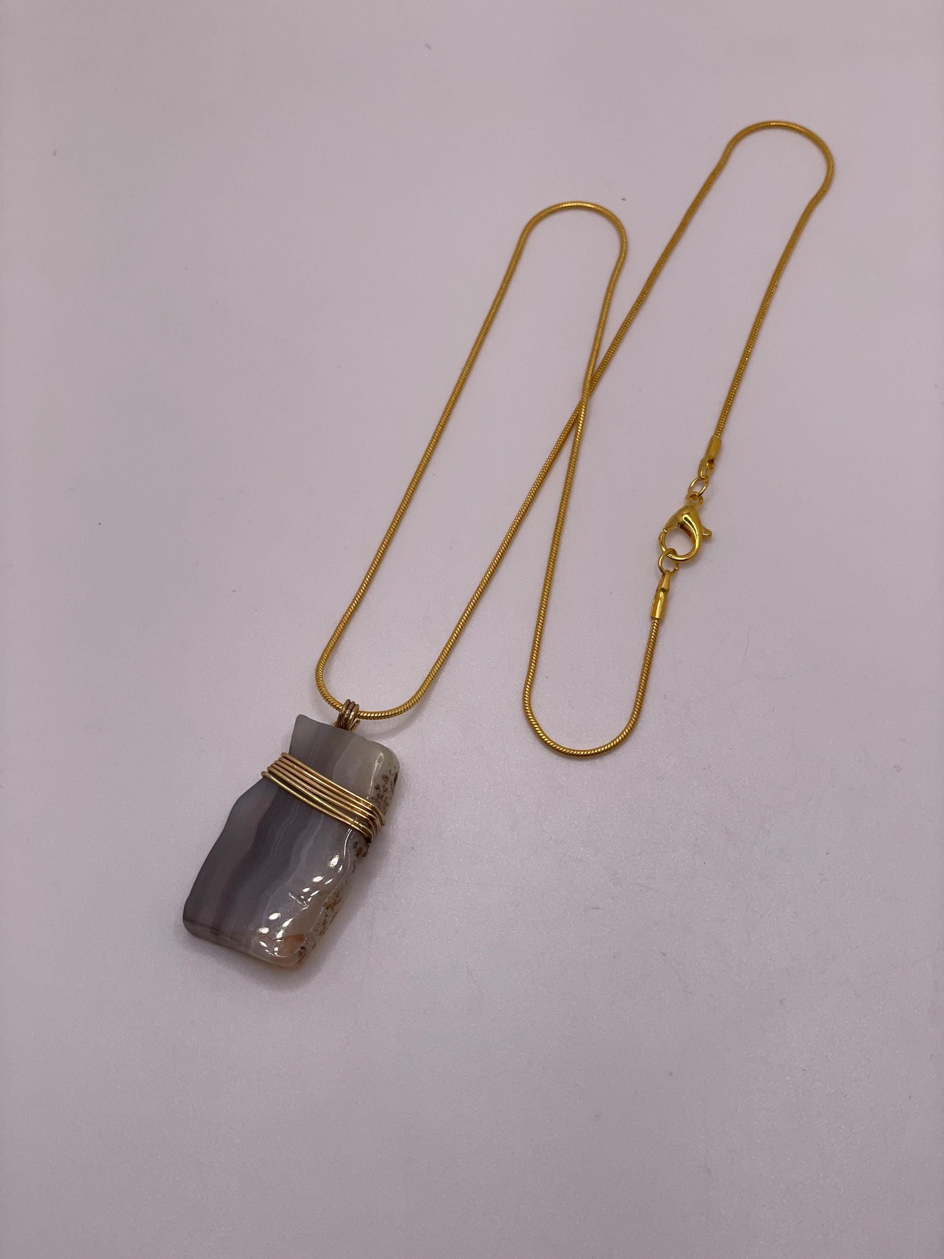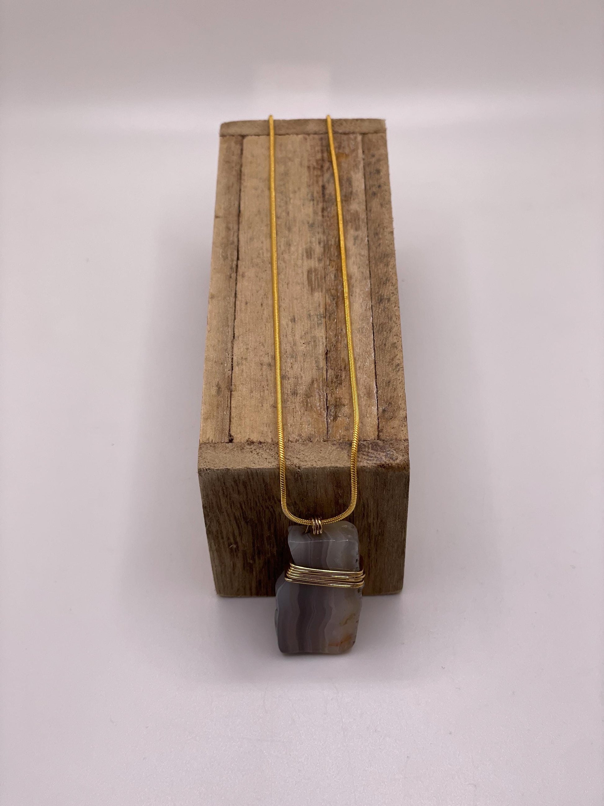 This beautiful wire wrapped Botswana Agate crystal necklace is on a gold plated snake chain.