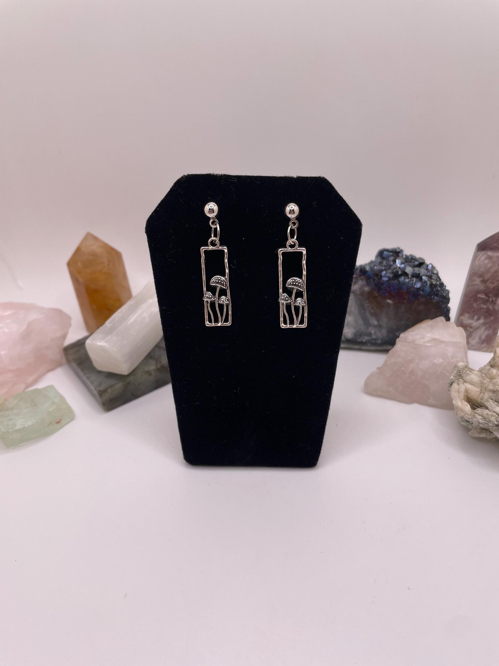 Silver Rectangle Mushroom Dangle Earrings